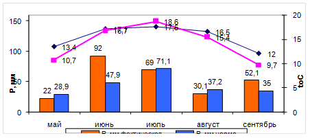 Как видно из табл. 1 среднемесячная температура за весь вегетационный период 2002 г. была выше нормы, лишь в июле ниже нормы 17,5оС (норма 18,6оС). Осадков в июне и сентябре выпало больше нормы 92 и 52,1 мм (норма 28,9 и 35 мм), отметим, что в июне выпала почти двойная норма, в мае, июле и августе – только от 76 – 97% от нормы. Всего за период выпало 265 мм осадков (по норме 220 мм). Самый влажный месяц – июнь, осадков в этот месяц выпало 92 мм – 192% (по норме 47,9мм), а самый сухой месяц – это май, осадков выпало 22 мм (по норме 28,9 мм). Наиболее близким к среднемноголетним значениям можно назвать июль, так как осадков выпало чуть меньше нормы 69 мм (норма – 71,1 мм), а среднемесячная температура была чуть выше нормы 17,1оС против 16,7оС по норме. Все вышесказанное графически показано на рис. 1.