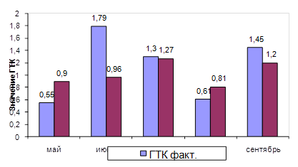 Как видно из табл. 2 наибольшее значение ГТК наблюдается в июне (1,79 против 0,96), действительно он является самым влажным месяцем, также влажным является сентябрь (ГТК составляет 121% от нормы), в остальные месяцы ГТК не превышает норму, и зона увлажнения считается от слабо (июль) до очень засушливой (май и август). Все вышесказанное графически показано на рис. 2.