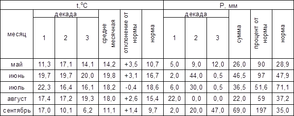 Как видно из табл. 3 среднемесячная температура за весь вегетационный период была выше нормы и лишь в июле ниже нормы 18,2 (норма 18,6; соблюдается тенденция прошлого года). Осадки за весь вегетационный период не превышали нормы, (исключение составляет только сентябрь, но эти осадки никак не повлияли на урожайность яровой пшеницы). В сумме за вегетационный период выпало 200 мм осадков (по норме 220 мм), но большая часть выпала в сентябре. Самый сухой месяц – это июль, осадков выпало 36,5 мм (норма 71 мм). Самым влажным месяцем был сентябрь, когда выпало 69 мм осадков (норма 35 мм). Наиболее близким к среднемноголетним значениям по количеству осадков можно назвать июнь, так как количество осадков составило 46,5 мм (норма 47,9 мм), но отметим, что среднемесячная температура была выше нормы на 3,1оС. Все вышесказанное графически показано на рис. 3.