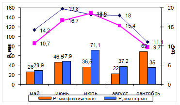 Как видно из табл. 4 максимальное значение ГТК наблюдается в сентябре (173% от нормы), действительно, это самый влажный месяц, в остальные месяцы ГТК не превышает норму, и зона увлажнения колеблется от засушливой (июнь) до сухой (август). Все вышесказанное графически показано на рис. 4.