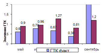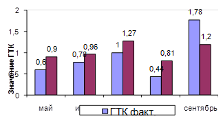 Как видно из табл. 6 наибольшее значение ГТК наблюдается в сентябре (148% от нормы), действительно он является самым влажным месяцем, в остальные месяцы ГТК не превышает норму, зона увлажнения от засушливой (июнь, июль) до сухой (август). Все вышесказанное графически показано на рис. 6.