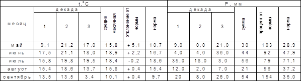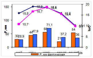 Как видно из табл. 5 среднемесячная температура за весь вегетационный период была выше нормы и лишь в июле она снова ниже нормы 18,4 (норма 18,6). Осадки за весь вегетационный период не превышали нормы, (исключение составляет месяц май, где норма была превышена только на 3%, и сентябрь, но его осадки никак не повлияли на урожайность яровой пшеницы), причем были намного ниже среднемноголетних значений. Всего за вегетационный период выпало 205 мм осадков (норма 220 мм), большую часть составляют осадки сентября. Самый сухой месяц – август, осадков выпало 21 мм (норма 37,2 мм). Наиболее близким к среднемноголетним значениям по количеству осадков можно назвать июнь, так как в этот месяц количество осадков составило 44 мм против 47,9 мм по норме, хотя среднемесячная температура здесь выше нормы на 2,2оС. Все вышесказанное графически показано на рис. 5.