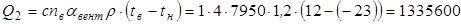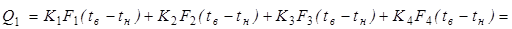 - поток теплоты, проходящий через ограничения конструкций (стены, чердак, ворота, окна), кДж/ч;