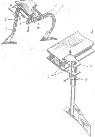Выполняется так же, как и у других культиваторов. Вертикальный нож, помещенный на левой стороне рамы культиватора при асимметрично расположенном прицепе, регулируют по высоте перестановкой стойки в кронштейне 7. Закреплением стойки в то или другое отверстие 8 определяют глубину погружения ножа в почву. Для изменения угла поворота крыла ножа используют отверстия б в кронштейне.