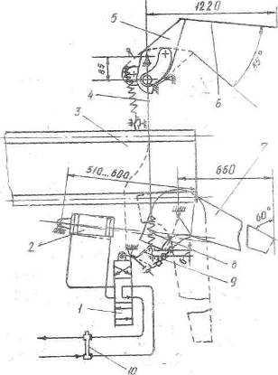 Рис. 9. Схема гидропривода: 1 – золотник; 2 – гидроцилиндр; 3 – рама культиватора; 4 – тяга; 5 – включатель; 6 – щуп; 7 – поворотная лапа; 8 – пружина тяги; 9 – двуплечий рычаг; 10 – предохранительный клапан