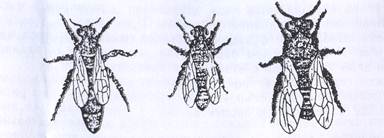 Рис.1. Особи, составляющие семью пчел: а- матка; б- рабочая пчела; в- трутень.