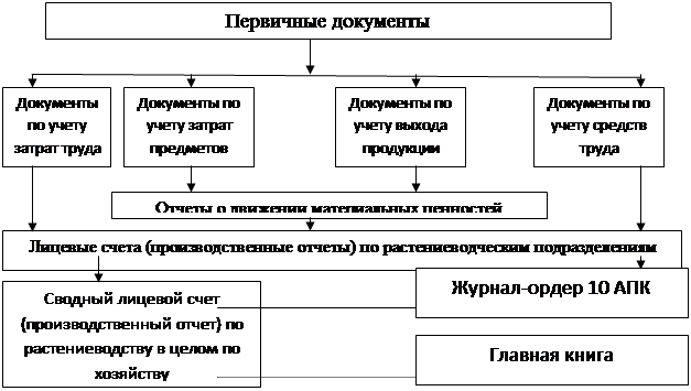 Синтетический учет затрат на производство зерновых культур при журнально-ордерной формы учета ведут в журнале-ордере 10 АПК. Лицевые счета являются основанием для записей в регистры журнально-ордерной формы учета. Журнал-ордер построен по принципу шахматной ведомости. В подлежащем указываются дебетуемые производственные счета и данные для корректировки затрат, а в сказуемом – кредитуемые счета. Для обобщения всех затрат на производство в журнале-ордере 10 АПК отражаются суммы производственных расходов, учтенные в других журналах-ордерах.