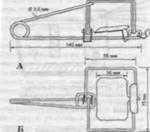 Изготавливая пружинящую станину из неотпушенной проволоки, прогибы для опоры дуг делать трудно, поэтому можно делать ее без прогибов, а дуги крепить с помощью серьги - скобоки, согнутой из более мягкой проволоки.
