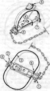 1- пружина; 2 - рамка; 3 - дуга; 4 - на-сторожка; 5 - сторожок; 6 - стопорная серьга; 7 - хомут