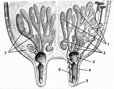Рис.1 Строение вымени коровы: 1 – молочная железа; 2 – молочные протоки; 3 – молочная цистерна; 4 – цистерна соска; 5 – сфинктер соска; 6 – нервы; 7 – соединительная ткань