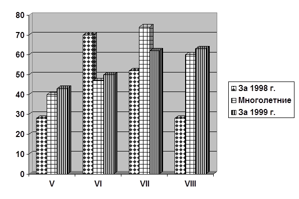 В 1999 году весна была затяжной. Среднемесячная температурная составила 10,4°С, что на 9,4% больше средней многолетней 10°С (рис. 2). Август был холодным и влажным. Что затруднило уборку зерновых культур.