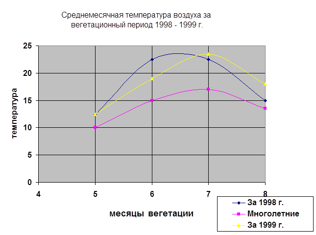 Весна 1998 года была прохладной. Сумма эффективных температур за период вегетации составила 236°С. в июне выпало 68,3 мм осадков, что больше средней многолетней на 16,1% (рис. 1).