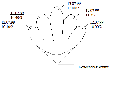 Изучение характера цветения колосков проводилось на 15 главных колосьев каждого сорта по методике Т Житковой (1914 г.). Эти колосья отмечались этикетками. Дата цветения, время открытия и закрытия цветка, число вышедших пыльников, записывались по схеме (рис. 3). В течение всего периода цветения проводились ежедневные метеорологические наблюдения. Температуру и влажность воздуха фиксировались каждый час. Суточный термограф и гигрограф устанавливали на уровне колосьев под защитой от прямых солнечных лучей. После окончания цветения путем просмотра цветков с помощью пинцета определяли число оставшихся или вышедших пыльников. При отсутствии хотя бы одного пыльника, цветение считалось открытым. Наличие всех трех пыльников внутри цветка – закрытое цветение. Цветки с защищенными пыльниками между цветковыми чешуями относились к комбинированному (смешанному) типу цветения. Затем проводили подсчет открыто цветущих цветков в пределах колоса и в среднем по всему сорту.