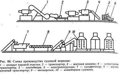 Искусственная сушка. Основной способ искусственной сушки овощей, плодов и картофеля - тепловой, с использованием в качестве теплоносителя воздуха, нагретого с помощью калориферов. Рабочая часть большинства сушилок состоит из камеры, в которой продукт размещают на стеллажах с сетчатой поверхностью. Нестандартные свежие овощи и плоды успешно перерабатывают на сушеные продукты. На рисунке 6 приведена технологическая схема производства сушеной моркови из нестандартных корнеплодов (начало процесса с шестой позиции).