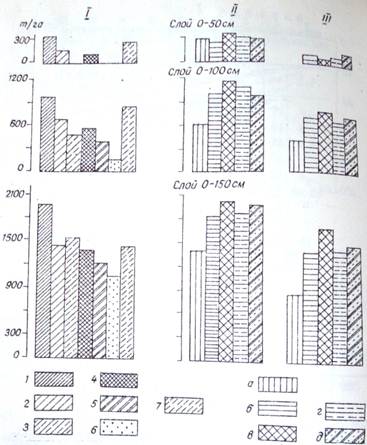 По массовым определениям объемного веса и карбонатов исчислены их запасы (в т/га) в отдельных слоях ряда подтипов чернозёмов (рис.2). Из зональных подтипов они занимают первое место по запасам карбонатов в слоях 0,5, 1 и 1,5 м; лишь черноземы солонцеватые (переходный подтип) перекрывают их. Сопоставим по послойным запасам СаС03 черноземы карбонатные и обыкновенные, стоящие в эволюционном ряду на следующем месте. В слое 0,5 м отмечено подтиповое диагностическое различие обеих почв, которое сохраняется в метровой и даже полутораметровой толще. Из этого следует, что проходит или происходило в прошлом не только перераспределение карбонатов в ее пределах, но и частичный их вынос в более глубокие слои.