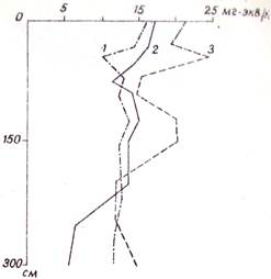 Рис.3. Профильное распределение активности ионов кальция (мг*экв/л почвенного раствора) в плантажированных черноземах: