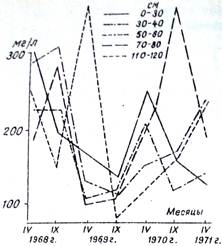 Также если сравнить количество Са в карбонатных и обыкновенных чернозёмах, то можно увидеть существенную разницу: количество кальция в Чк в 1,7-2,1 раза выше, чем в обыкновенном. Различие в пользу первого наблюдается даже в тех слоях, где обыкновенные чернозёмы уже содержат СаСО3. Количество кальция в почвенных растворах из черноземов динамично по глубинам, месяцам и годам (рис.6). Однако и при учете этого обстоятельства приоритет Чк выглядит абсолютно бесспорным. Таким образом, установлена ещё одна кардинальная генетическая особенность карбонатных чернозёмов.