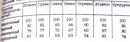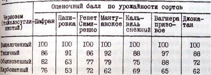 принят выщелоченный чернозем, оказавшийся лучшей почвой для плодовых культур. Под влиянием карбонатности яблоня, груша, слива, вишня и черешня сильнее снижают свою урожайность, чем кукуруза. Только абрикос (81 балл) слабее реагирует на этот фактор (Рябинина, 1978). Интересно, что разные сорта деревьев неодинаково реагируют на карбонатность черноземов (табл.9). Из сортов яблони меньше всего снижает урожайность на этих почвах Шафран (76 баллов) и Ренет Симиренко (72 балла), тогда как Папировка в данном случае вдвое менее производительна, чем на выщелоченном черноземе (Рябинина, 1978). Подобным же образом ведет себя слива. В среднем для четырех ее сортов урожайный бонитет на карбонатных черноземах составляет 58 баллов, для сорта Венгерка обыкновенная - 72 и сорта Ренклод Альтана - 52 балла.