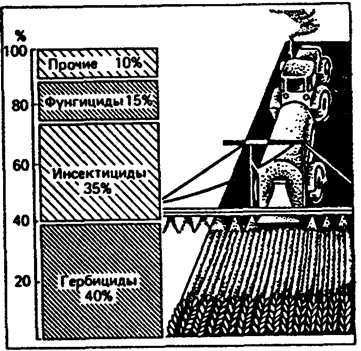 В ассортименте химических средств защиты растений средства борьбы с сорняками (гербициды) занимают 40%, средства борьбы с вредителями (инсектициды) —35%, средства борьбы с болезнями (фунгициды) — 15%, прочие — 10% (рис. 4).