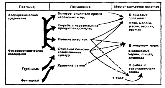 Воздействие пестицидов на агроэкосистемы. Пестициды, применяемые в сельском хозяйстве, относятся к различным классам главным образом органических соединений (хлорорганические, фосфорорганические, симметричные триазины, гетероциклические соединения и др.), обладают токсичностью не только для вредных организмов, но и человека, животных, несут опасность для окружающей среды. Пестицид, каким бы он ни был, неизбежно вызывает глубокие изменения всей экосистемы, в которую его внедрили. Из совокупности экологических свойств, присущих всем пестицидам, действия их никогда не бывают однозначными.[5]