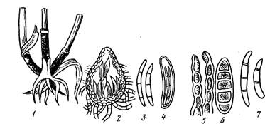 1 - пораженный стебель; 2-7- спороношение возбудителей корневых гнилей.