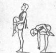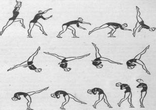 в) в стойке на руках прогнуться и согнуть ноги в коленных суставах (партнер поддерживает за ноги и под живот). Резко разогнуть ноги под углом вверх (партнер отпускает ноги) и, оттолкнувшись руками, быстро согнуться в тазобедренных суставах. Поставив ноги на мат, выпрямиться, руки вверху; то же без помощи;