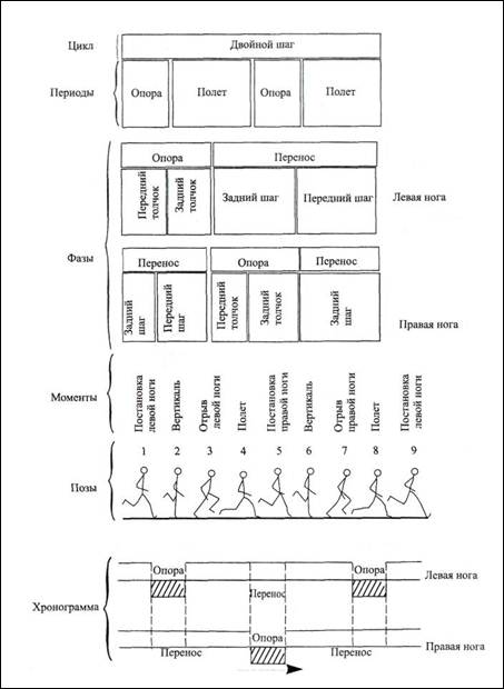 В цикл входят фазы движения, заключающиеся между двумя совершенно одинаковыми положениями тела. В беге циклом является двойной шаг, в течение которого каждая часть тела проходит все фазы движения (рис. 1.).