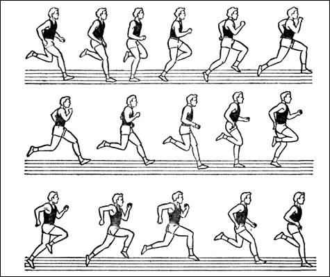 Бег по дистанции. К моменту достижения высшей скорости туловище бегуна незначительно (72-80°) наклонено вперед. В течение бегового шага происходит изменение величины наклона. Во время отталкивания наклон туловища уменьшается, а в полетной фазе он увеличивается.