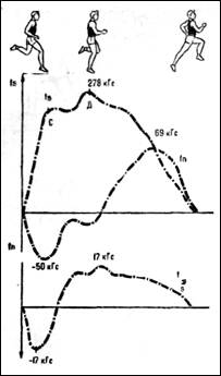 Рис. 7.Динамические характеристики взаимодействия спринтера с опорой в бегепо дистанции: fs – вертикальная, fп – горизонтальная,