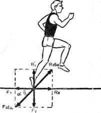 Когда тело бегуна находится прямо над центром давления на площадь опоры, то реакция опоры под действием массы тела бегуна направлена вертикально вверх (вертикальная составляющая реакция опоры). Но ОЦМТ не всегда находится над центром давления на опору. В этом случае опорная реакция будет направлена под острым углом. Поэтому силу давления (F) и силу реакции опоры (R) можно разложить на две составляющие: вертикальную (Fy, Ry) и горизонтальную (Fx, Rx). Равнодействующая этих величин и будет определять движение бегуна. Вертикальная составляющая реакции опоры противодействует силе тяжести. В том случае, когда Fy больше веса тела бегуна, движение ОЦМТ направлено вверх, и наоборот. Горизонтальная составляющая реакции опоры зависит от общей силы давления на грунт (Fo6щ) и от угла α, под которым производится давление, и играет первостепенное значение в поступательном движении. Угол α называют углом отталкивания. Угол отталкивания определяется по углу наклона продольной оси ноги в момент отталкивания от дорожки. Продольная ось соединяет точку давления ноги на опору и тазобедренный сустав. Кроме того, в биомеханике спорта угол отталкивания определяют по направлению опорной реакции, по направлению линии, соединяющей точку опоры с ОЦМТ, по направлению ускорения ОЦМТ Он определяет направление равнодействующей Fx и Fy (рис. 9.). В спринтерском беге величина Fo6щ, намного больше, чем в беге на средние и длинные дистанции, и направлена под более острым углом.