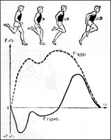 Горизонтальные усилия бегуна с момента постановки ноги и до начала фазы отталкивания направлены вперед и создают торможение (отрицательное ускорение). Затем в фазе отталкивания давление на опору направлено назад, при этом создается положительное ускорение большинству звеньев тела, а значит, и ОЦМТ.