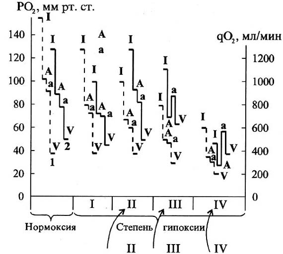 Рис. 1. Степени гмпоксической гипоксии: I - скрытая; II - компенсированная; III - субкомпенсированная; IV - декомпенсированная. Штрихом обозначены каскады pO2, сплошной линией - каскады поэтапной скорости доставки O2 (qO2). I - вдыхаемый воздух, А - альвеолярный воздух, а - артериальная, V - смешанная венозная кровь