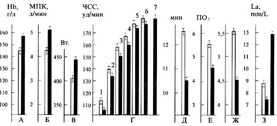 Рис. 2. Изменения содержания: А - гемоглобина в крови волейболистов, легкоатлетов, Б - МПК велосипедистов, В -предельной мощности гребцов на байдарке, Г - ЧСС гребцов-академистов в эргометрическом тесте, Д - времени прохождения контрольной дистанции на байдарке в гребном канале (дистанция - 2 км), Е - потребление кислорода у гребцов на байдарке во время гребли, Ж - их кислородного долга, 3 - содержание лактата до курса ИГТ на предельной нагрузке и после него на такой же нагрузке и на нагрузке большей мощности, после курса ИГТ, проведенного на фоне планового тренировочного процесса спортсменов. Незаштрихованный столбец - до, заштрихованный - после курса комбинированной тренировки