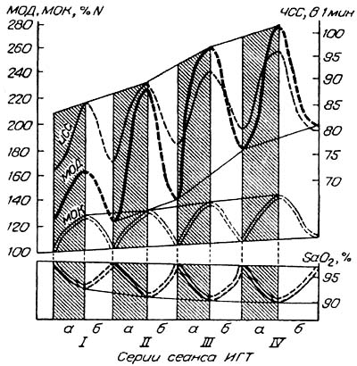 оказывается более эффективным методом адаптации к гипоксии, чем непрерывное. Адаптация к гипоксии в этом случае осуществляется в более короткие сроки. Проведенные исследования позволили нам обосновать режимы ИГТ: содержание O2 в гипоксической смеси, длительность гипоксических воздействия и интервала в каждой серии, количества серий в сеансе.