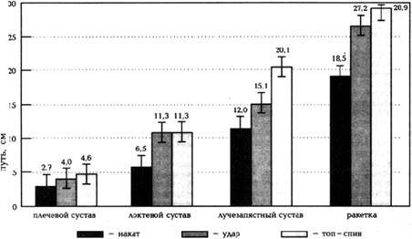 Рис. 3. Общий средний путь сопровождения звеньев руки и ракетки при выполнении наката, топ-спина и удара справа