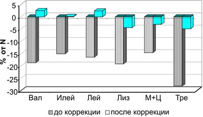 Для спортсменов, специализирующихся в единоборствах, в базовых рационах питания важно оптимизировать потребление белков, поскольку преобладание силового компонента вызывает существенные изменения в белковом обмене. С целью коррекции выявленных нарушений и оптимизации ингредиентов питания атлетов путем компьютерного моделирования подобраны количественные соотношения традиционных и нетрадиционных компонентов, обеспечивающих необходимое функциональное назначение, соответствующее этапу тренировочного цикла. На рисунке представлены результаты оптимизации аминокислотного компонента базовых рационов питания борцов после введения в них разработанной композиции.