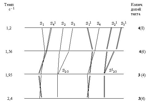 На рис. 2 приводятся графическая интерпретация изменения количества долей такта и их распределение по его размеру в зависимости от темпа педалирования. При Т = 1,2 с-1 такт содержит 4 доли. В случае учета работы обеими нижними конечностями количество этих долей равно 8. С увеличением темпа до 2,4 с-1 количество долей снижается соответственно до 3 и 4. Вторая и третья доли объединяются, и это общее усилие обозначено как S2-3 (см. рис. 1 и 2).