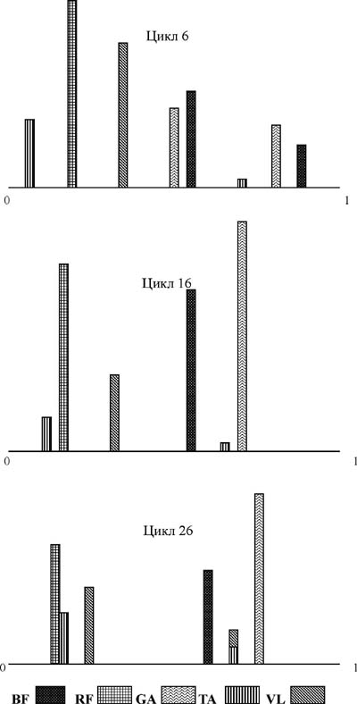 Для начальных моментов времени (цикл 6) паттерн двигательной активности представляет собой раздробленную картину проявления усилий отдельных мышц. С увеличением темпа начинает проявляться объединение зон активности в первой и второй половинах циклов. Между ними наблюдается переходный этап активности мышц VL и BF (цикл 16). Но при дальнейшем увеличении темпа подобный четырехдольный такт трансформируется в двухдольный (цикл 26), в котором активность мышц проявляется в форме объединений активности в двух разных временных зонах цикла.