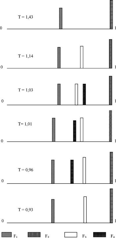 На рис. 4 представлены диаграммы распределения усилий, а в табл. 3 приведены количественные показатели ритма в структуре движения мастера спорта весовой категории 85 кг при подъеме штанги. Здесь F1 , F2 , F3 , F4 - усилия, а t1, t2, t3, t4 - соответственно время проявления этих усилий в отдельных фазах движения. Характерным является увеличение долей ритмического рисунка движения со снижением скорости выполнения движения (увеличением веса штанги) и одновременным увеличением проявляемых при этом напряжений.