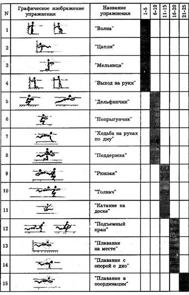 На последующих пяти занятиях (16-20-е) выполнялись такие упражнения, как "плавание в облегченных условиях" с постановкой руки на дно, с поддержкой партнера.