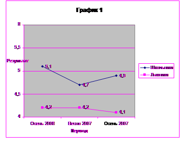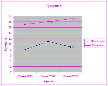 Также развивается и у школьников, и у лыжников. У школьников наблюдается значительный прирост результата весной 2007 года (11 раз), а осенью 2007 года небольшое снижение (9 раз). У лыжников средний результат осенью 2006 года – 17 раз, затем происходит незначительное увеличение. Данные изменения можно проследить на графике 6.