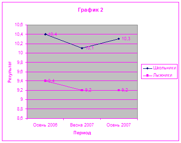 У школьников результат изменялся таким образом, что результат, полученный осенью 2007 года (10,3 с) был лучше, чем осенью 2006 года (10,4 с), но хуже чем весной 2007 года (10,1 с). У лыжников результаты весной и осенью 2007 года (9,2 с) улучшились, по сравнению с осенью 2006 года (9,4 с). В целом у школьников и у лыжников результаты выросли в среднем на 0,1 с и на 0,2 с соответственно. На графике 2 видны незначительные улучшения координации у школьников и стабилизации у лыжников.