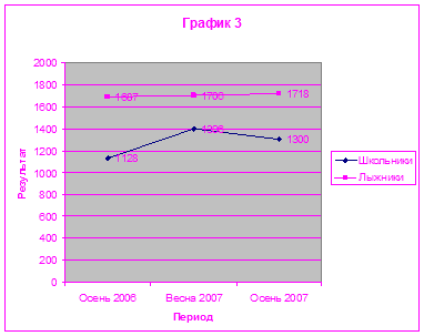 Развивается у школьников и у лыжников. На графике 3 видно увеличение среднего результата школьников весной 2007 года, затем небольшое снижение осенью 2007 года. У лыжников прослеживается равномерный рост результатов.