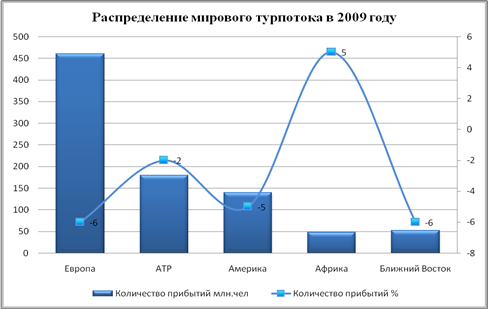 В докладе ЮНВТО "Барометр мирового туризма" говорится, что все регионы, кроме Африки, в 2009 году отметили уменьшение количества прибывающих туристов. В Европе туристический поток сократился на -5%, в Америке – на 5%. Южная Америка – оказалась единственным субрегионом, кроме Африки (+5%), который выбивается из общей отрицательной тенденции с результатом +0,2%. Ситуация в азиатско-тихоокеанском регионе (-6%) кажется особенно сложной в сравнении с результатами прошлых лет, а падение спроса в этом регионе произошло гораздо быстрее, чем ожидалось.