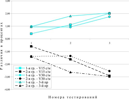 Как видно из рисунка, в 1-й группе (высокая СПР) наблюдается прогрессивное улучшение результатов всех тестов, указывающее на достаточно высокую эффективность тренировочного процесса. В то же время во 2-й группе отмечено столь же прогрессивное ухудшение результатов всех тестов, свидетельствующее, наоборот, о низкой эффективности тренировочного процесса. Но ведь это одна и та же команда, работающая по одним и тем же планам и выполняющая одни и те же тренировочные нагрузки.