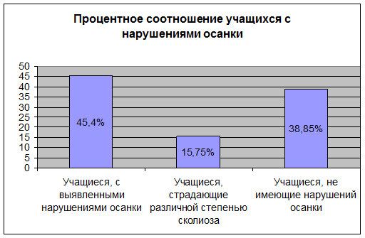В результате анализа медицинских карт в Маркушевской средней общеобразовательной школе за 2007 год получили следующие данные: из 108 учащихся всей школы у 49 школьников выявлены нарушения осанки, что составляет 45,4% и 17 учащихся страдают различной степенью сколиоза, что составляет 15,75% от общего количества школьников, и только 38,85% без нарушения осанки.