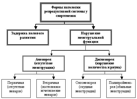 Теоретический анализ отечественной и зарубежной литературы позволяет выявить у спортсменок две наиболее значимых формы патологии репродуктивной системы: задержка полового развития, нарушение менструальной функции (рис.1).