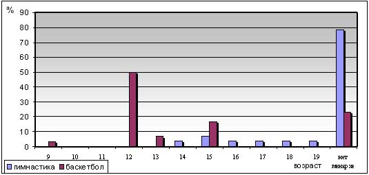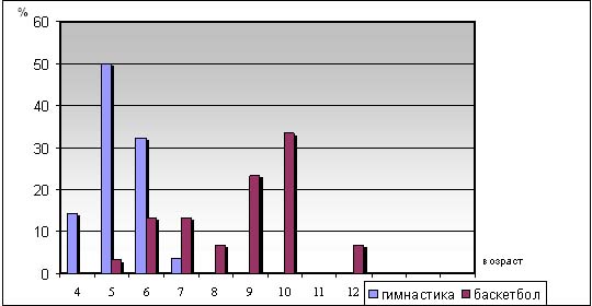 В ходе исследования нами были изучены данные, свидетельствующие о возрасте, в котором девочки начали тренировочную деятельность. В результате анализа полученных сведений было установлено, что девочки, специализирующиеся в спортивной гимнастике в 4 года начали тренировочную деятельность в 4 случаях (14, 29%), в 5 лет - в 14 случаях (50%), в 6 лет - в 9 случаях (32, 14%), в 7 лет - в одном случае (3, 57%). Начало занятий тренировочной деятельностью девочек, специализирующихся в баскетболе значительно позже: в 5 лет - в одном случае (3, 33%), в 6 лет - в 4 случаях (13, 33%), в 7 лет - в 4 случаях (13, 33%), в 8 лет - в 2 случаях (6, 67%), в 9 лет - в 7 случаях (23, 33%), в 10 лет - в 10 случаях (33, 33%), а в 12 лет - в 2 случаях (13, 33%) (рис.2).