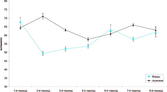 Анализ тренировочных программ лыжников-гонщиков позволил установить, что между различными составляющими тренировочных нагрузок и уровнем МПК имеются статистически значимые корреляционные связи. В частности между средней величиной суточного объема циклической нагрузки и уровнем МПК наблюдалась прямая зависимость (p< 0,01). Величина и уровень значимости коэффициента корреляции варьировались с изменением временного интервала между моментом регистрации МПК и периодом, когда эти нагрузки применялись. Так, уровень МПК у лыжников в условиях регулярных тренировок коррелировал не только с параметрами нагрузки ближайших занятий, но и с величиной нагрузок, применяемых ранее чем за месяц до обследования. Данные о динамике уровня МПК у борцов и лыжников в различные периоды годового цикла представлены на рисунке.