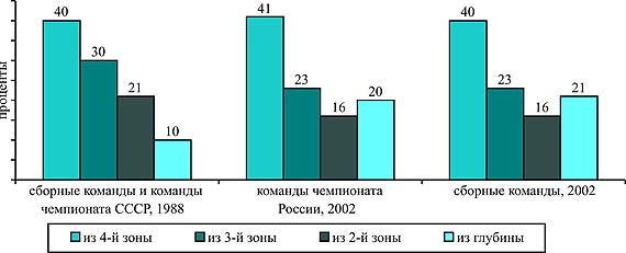 Характерная особенность современного волейбола - повышение доли атак из глубины площадки (рис. 1). В 80-е гг. 30% атак осуществлялось из зоны 3, в настоящее время их доля сократилась и составляет 23% в играх сборных команд и в чемпионате России. Таким образом, ведущие команды мира и России меньше используют атаки первым и вторым темпами из зоны 3.
